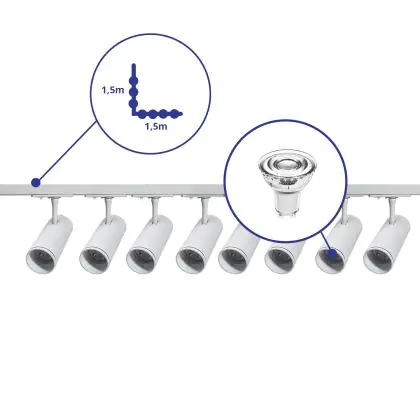 | Fabrikantnaam | Complete L shaped 1-Phase Track Set White incl. 8x Spot fixture + GU10 2700K 3W Dim – 1.5 x 1.5 mete | |