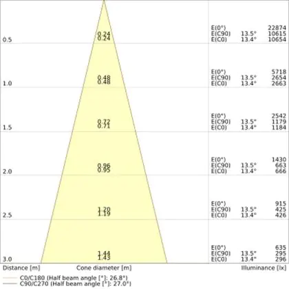 De gradenbundel geeft informatie over hoe breed het licht wordt uitgestraald. Dit zit tussen de 0 en 360 graden (D). Hoe kleiner de hoek, hoe specifieker de lichtbundel is. Over het algemeen is een smalle gradenbundel perfect voor sfeer- of accentverlichting, terwijl een brede gradenbundel ideaal is om grote oppervlaktes te verlichten.