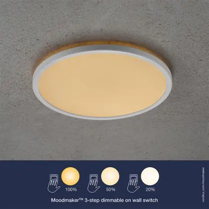 Dat je flexibel kunt zijn met licht, laat deze Oja plafondlamp van Nordlux duidelijk zien. De lamp is voorzien van een 3-staps Moodmaker functie, die je met behulp van je lichtschakelaar kunt instellen. In dit geval heb je 3 dimstanden, die een 2700K licht uitstralen: