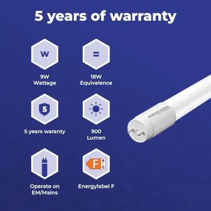 Deze Noxion LED TL buis heeft een Lumen / Watt efficiëntie van lm/W. Dit is de waarde die je verkrijgt door de lichtopbrengst (900 Lumen) te delen door het wattage (9W) van deze lichtbron. Hoe weet je of jouw lichtbron een goede efficiëntie heeft? In dit geval ligt de lm/W waarde boven de 65. Je kunt er ook voor kiezen om een LED geïntegreerd TL armatuur te kopen. Hierbij heb je de keuze uit diverse (waterdichte) LED montagebalken, die in een divers aantal Lumen verkrijgbaar zijn. Een (dimbaar) LED paneel is ook een slimme optie, met name voor ruimtes met een systeemplafond (eenvoudige installatie) en kantoren (UGR<19 varianten).