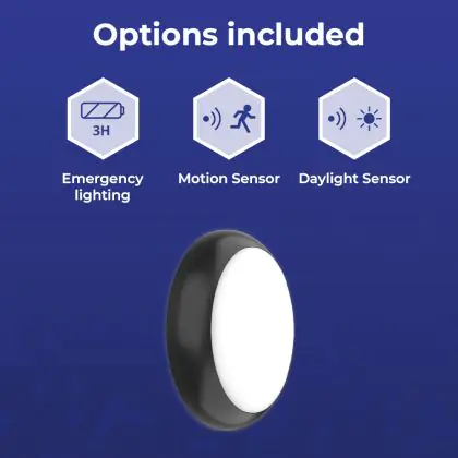 Beschrijving Noxion LED Bulkhead Pro V2 Wit 12/16/20W 2400lm - 830-840-865 CCT | 325mm - IP65 - Bewegings- en Lichtsensor - Nood 3H + Ring Zwart